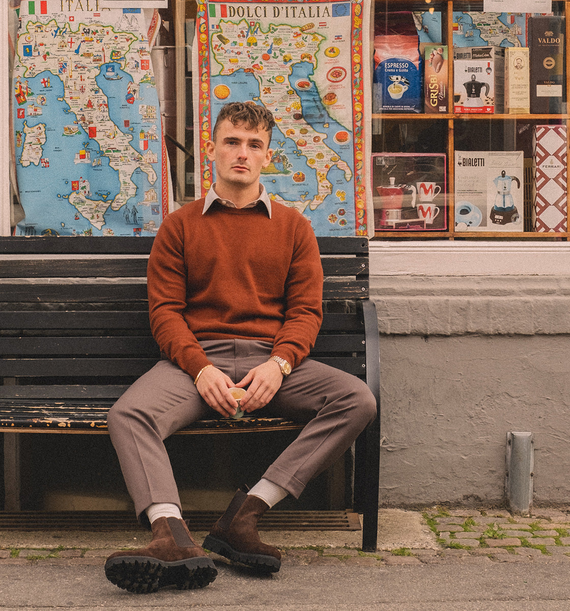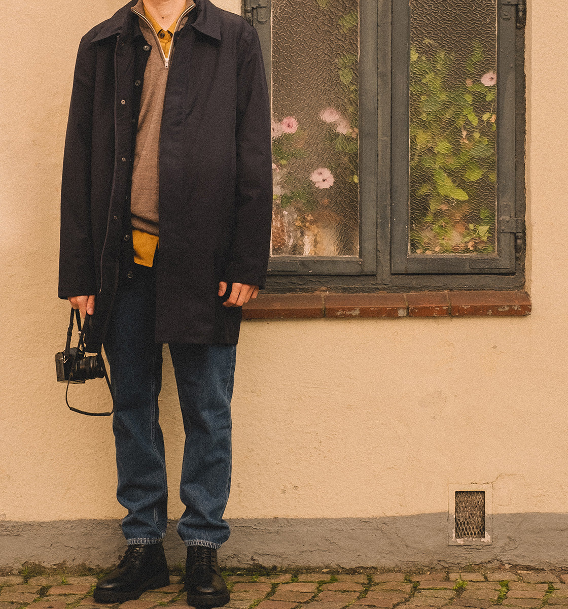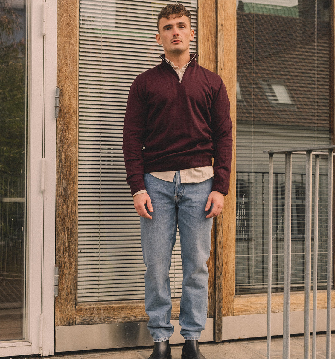 Halsudskæringen er et godt sted at vise dig lidt frem med din ekspertise i lagdeling, da det er der, hvor alle lagene mødes meget synligt. Praktisk talt er det også et område der bliver særligt køligt i hård vind, hvor det kan være rart at kunne lukke helt til, hvis du ikke bruger halstørkæde. En half-zip strik med en skjorte indenunder er et klassisk look som altid fungerer, men forsøg gerne at udfordre på farvesammensætningen. Eksempelvis som ovenstående look hvor vi har valgt en skjorte i farven ‘ivory’ og half-zip i burgundy, der giver noget ekstra kant.
