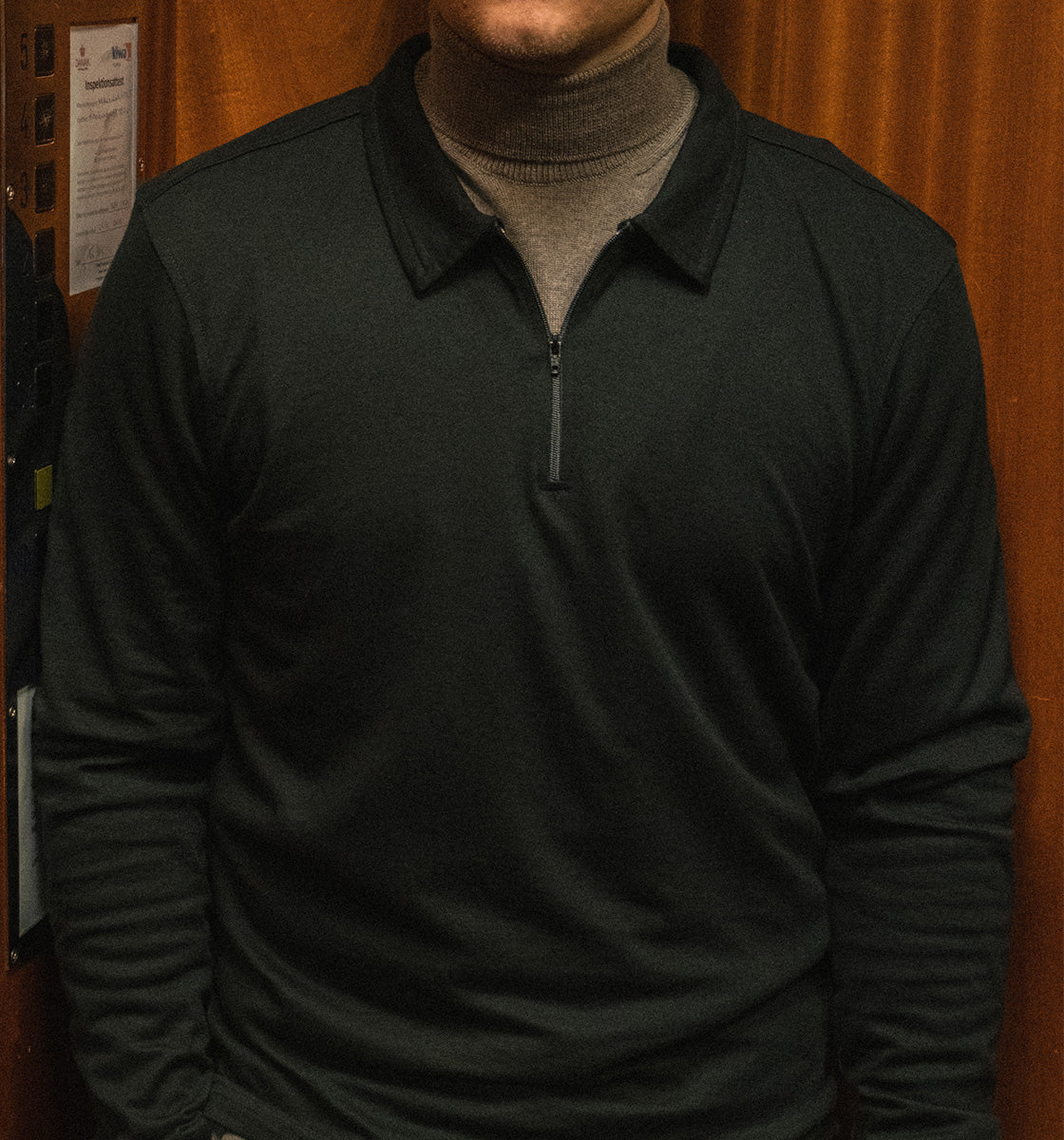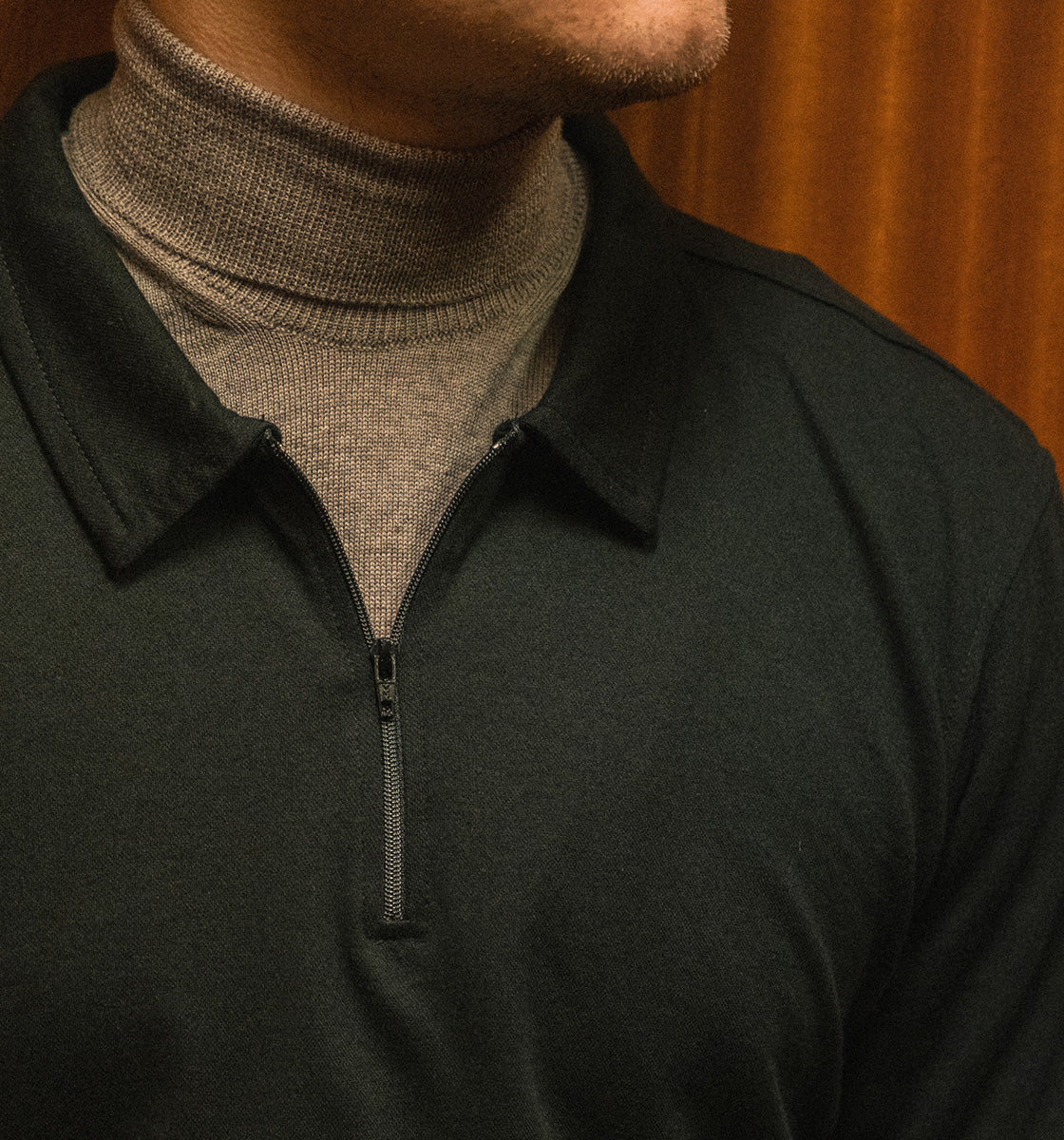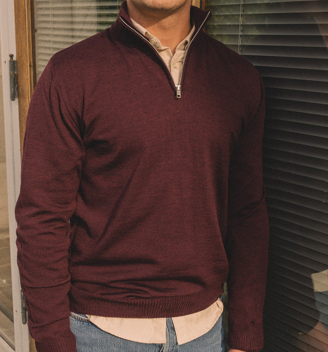 Halsudskæringen er et godt sted at vise dig lidt frem med din ekspertise i lagdeling, da det er der, hvor alle lagene mødes meget synligt. Praktisk talt er det også et område der bliver særligt køligt i hård vind, hvor det kan være rart at kunne lukke helt til, hvis du ikke bruger halstørkæde. En half-zip strik med en skjorte indenunder er et klassisk look som altid fungerer, men forsøg gerne at udfordre på farvesammensætningen. Eksempelvis som ovenstående look hvor vi har valgt en skjorte i farven ‘ivory’ og half-zip i burgundy, der giver noget ekstra kant.